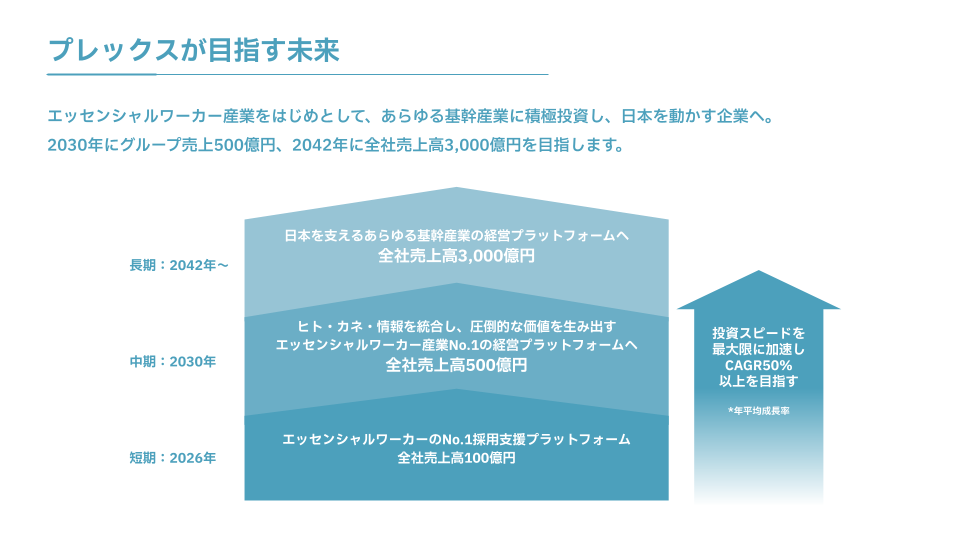 プレックスは創業以来、常に黒字で増収増益を続け、創業7期目で売上60億円を達成しました。しかし、まだまだ通過点。我々が目指すのは、真に「日本を動かす仕組みをつくる」ことです。エッセンシャルワーカー産業をはじめとして、あらゆる基幹産業に積極投資し、日本を動かすグループへ。2030年にグループ売上500億円、2042年に全社売上高3,000億円を目指します。