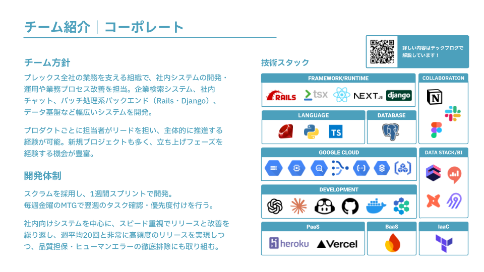 業界への貢献、チームメンバーのアウトプット促進、エンジニアへの認知獲得という目的で「プレックスプロダクトチームブログ」というタイトルのテックブログを月に1 ~ 2記事のペースで運用しています。テックブログの執筆を重要な業務と位置づけており、スプリントのタスクとして業務時間内に実施しています。