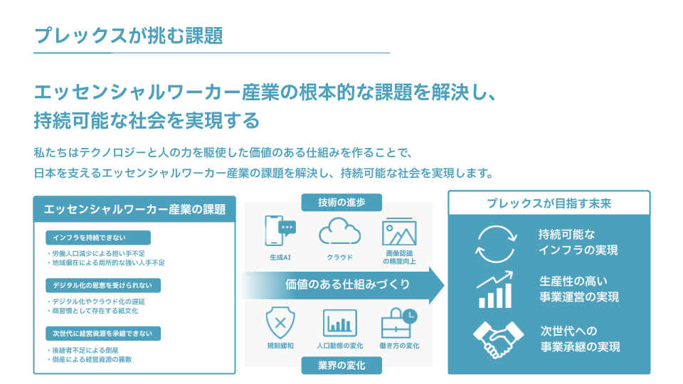 株式会社プレックスは、「日本を動かす仕組みをつくる」をミッションに、エッセンシャルワーカー産業の課題解決をはじめとして、人と企業の可能性を最大限に引き出す事業を展開する企業です。エッセンシャルワーカーの人材紹介を中心に対象職種を10にまで拡大し、新たにSaaS事業、M&A仲介事業を開始。現在も、新たな事業が次々と立ち上がり続けています。